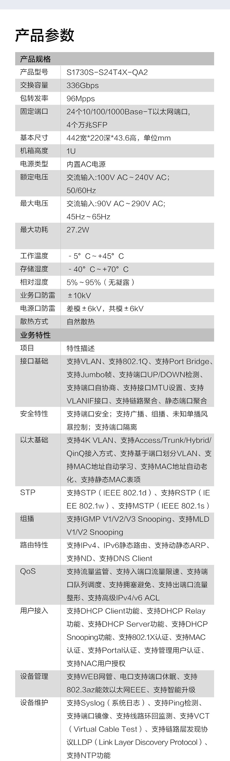 S1730S-S24T4X-QA2(24個10/100/1000BASE-T以太網(wǎng)端口,4個萬兆SFP+,交流供電) 交換容量336Gbps,包轉(zhuǎn)發(fā)率96Mpps,機(jī)架式,靜音款