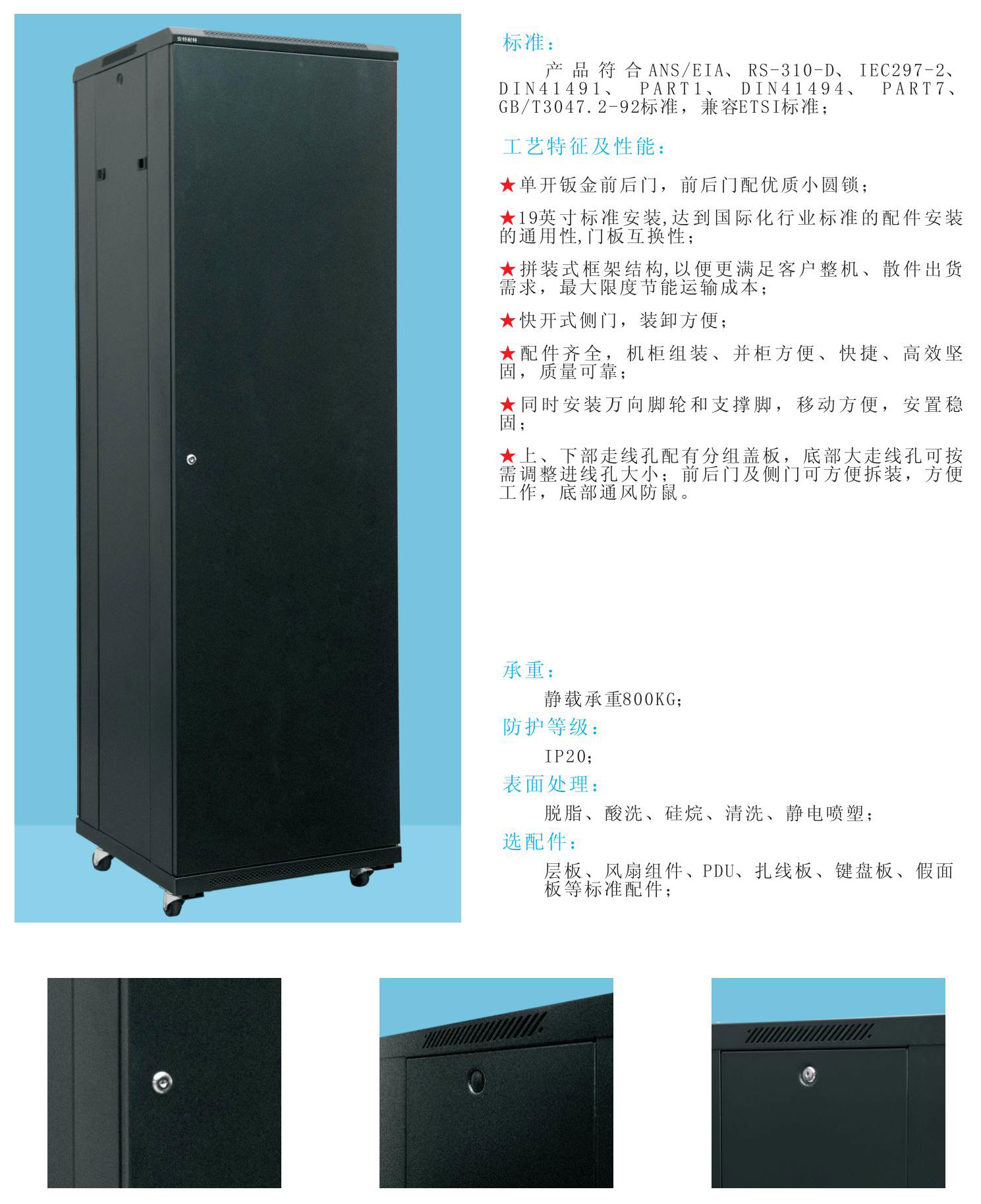 ★ 19 英寸標準安裝,達到國際化行業(yè)標準的配件安裝的通用性,門板互換性;